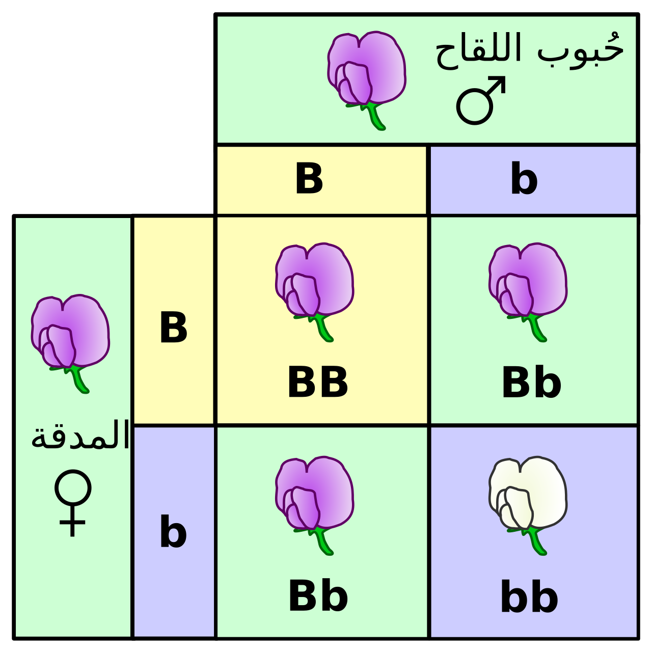 استخدمنا هذا الجدول آنذاك لفهم تجربة مؤسِّس علم الوراثة غريغور مندل ، التي أجراها على نبات البازلاء؛ إذ راقب مندل خصائص النبتة، مثل لون الزهرة، واضعًا أسس علم الوراثة، الذي يفترض أن أي صفة في الجسم ممثَّلة بنسختين من الجين (واحدة من الأم، وأخرى من الأب)، وبذلك تكون الصفة الظاهرة إمَّا لإحداهما، أو مزيجًا من الاثنتين.
